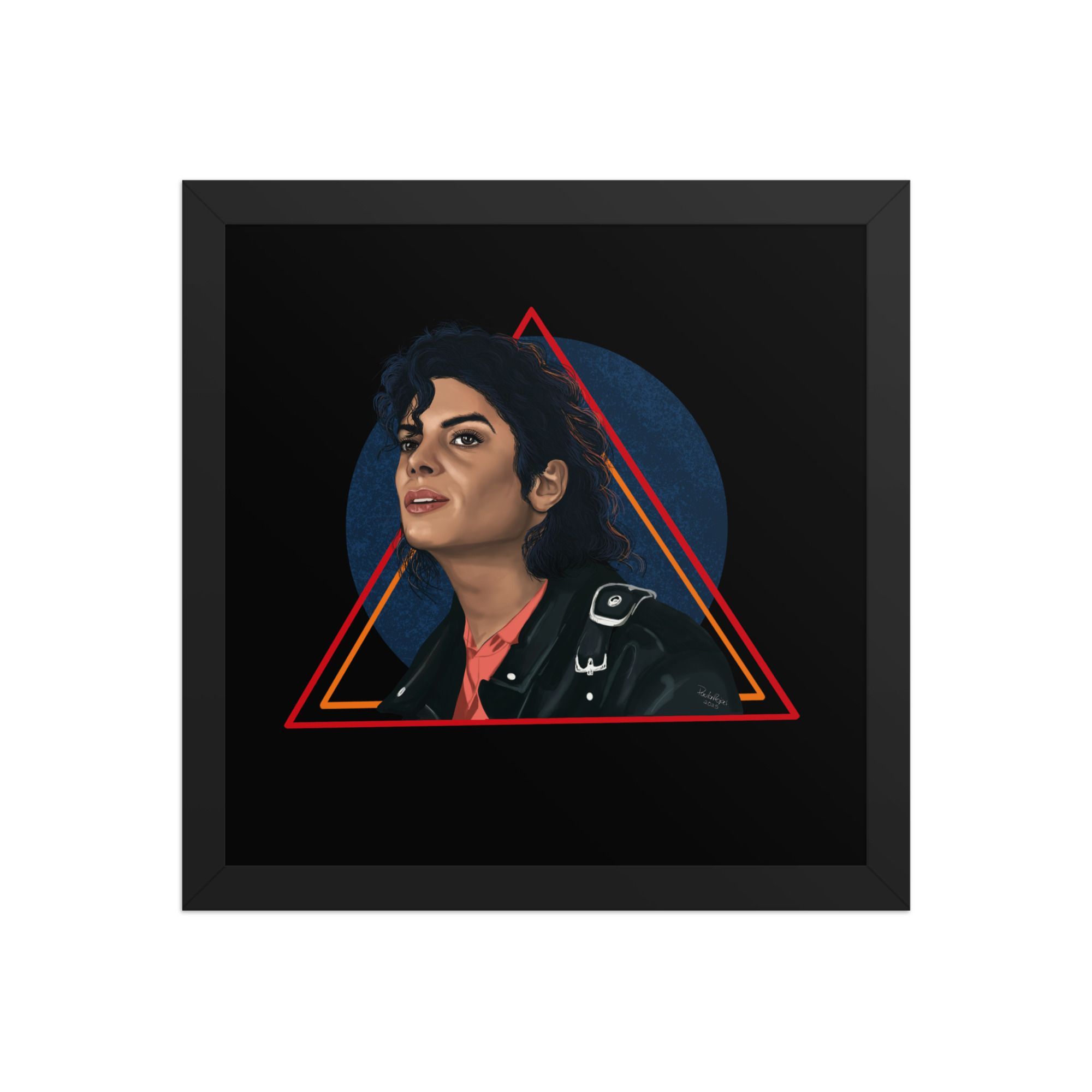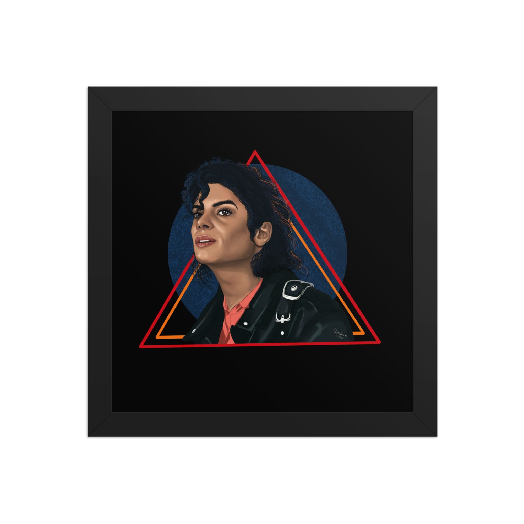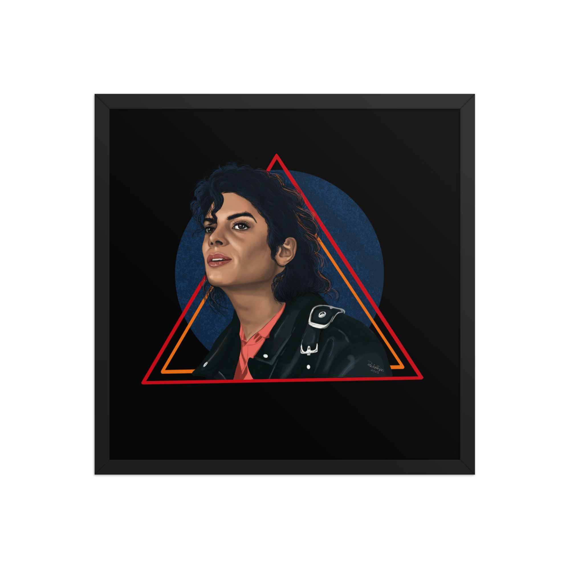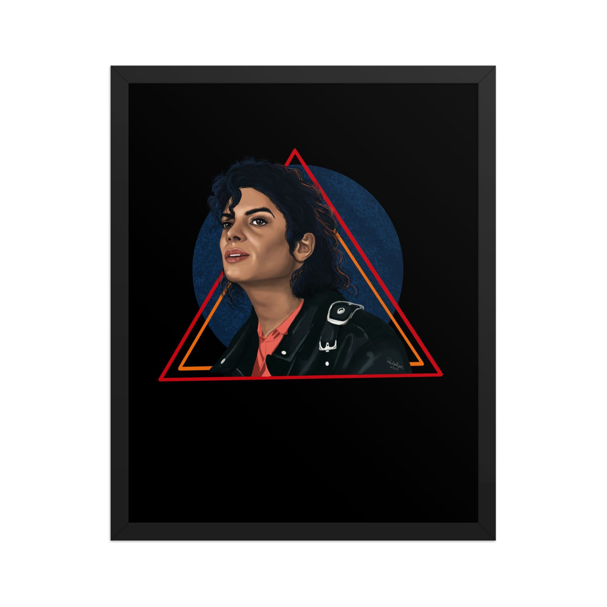 The digital painting captures Michael’s confident expression, his signature leather jacket, and a vibrant geometric backdrop that symbolizes rhythm, strength, and artistic brilliance. Printed on thick matte paper and framed with sustainably sourced wood, this artwork combines elegance with durability — perfect for collectors and true music lovers.